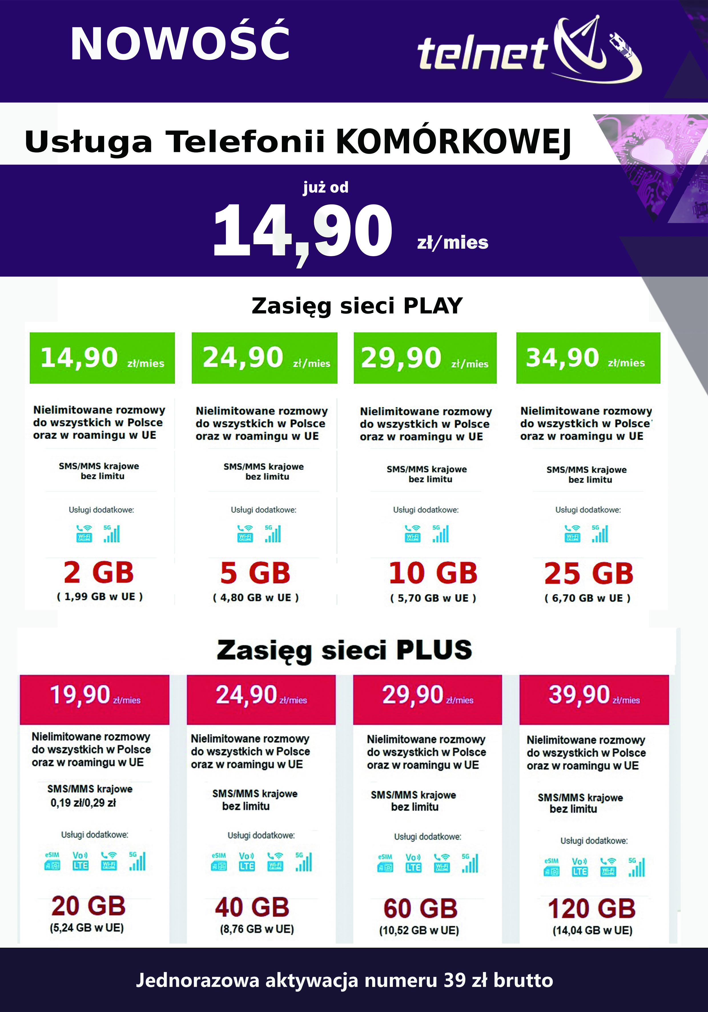 Od czerwca 2023 świadczymy usługi telefonii komórkowej, do wyboru mają  Państwo zasięg nadajników sieci Plus lub Play.